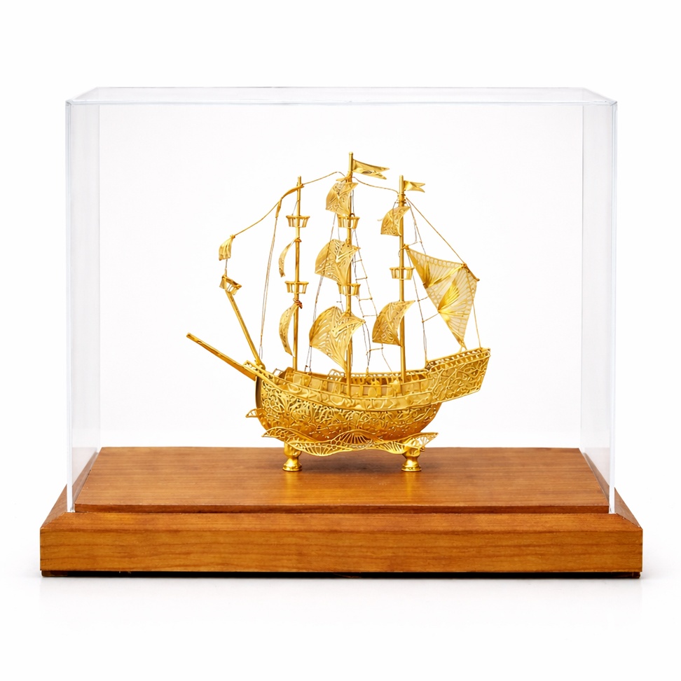 Sản phẩm được chế tác từ bạc mạ vàng 24k, tạo nên vẻ ngoài sáng đẹp, sang trọng và nổi bật. Từng chi tiết cánh buồm, thân thuyền và khung thuyền được gia công tinh tế, giúp tổng thể sản phẩm toát lên sự đẳng cấp và cuốn hút.