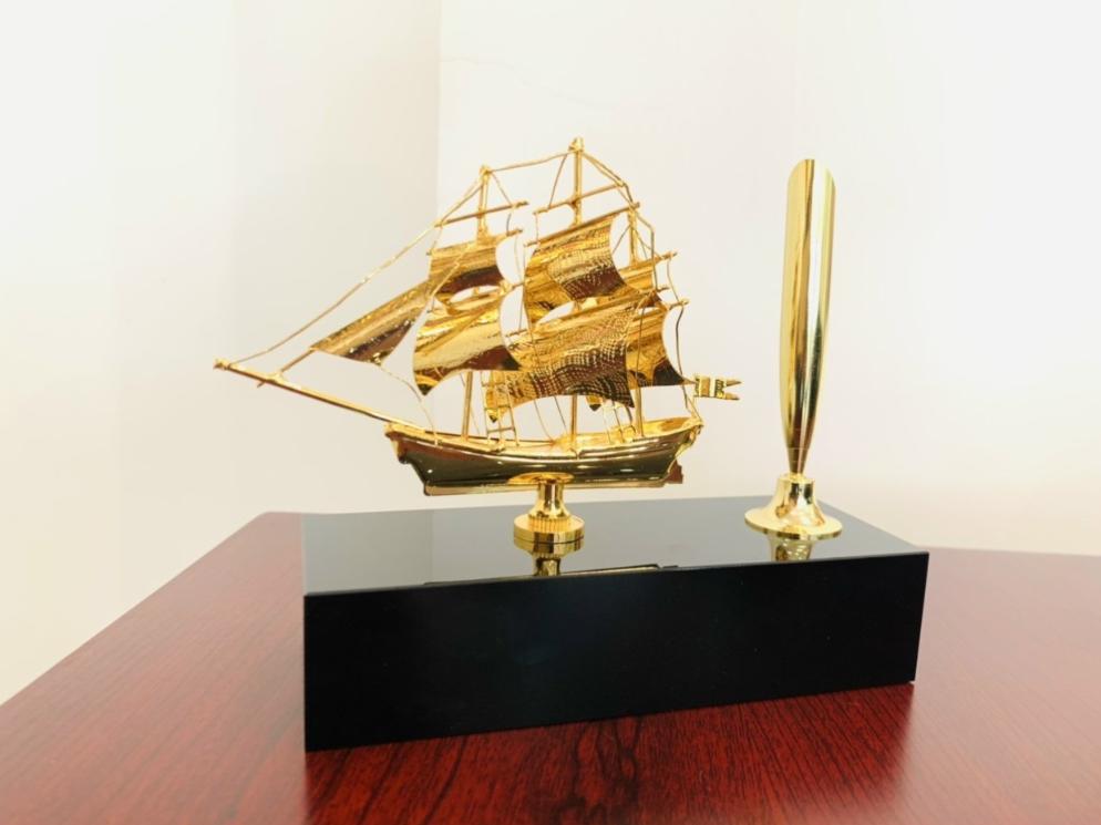 Bên cạnh thuyền, chi tiết ống bút dát vàng được đặt trên cùng chân đế không chỉ tạo điểm nhấn lạ mắt mà còn tăng tính ứng dụng cho sản phẩm, phù hợp để đặt trên bàn làm việc, bàn lãnh đạo hoặc phòng tiếp khách.