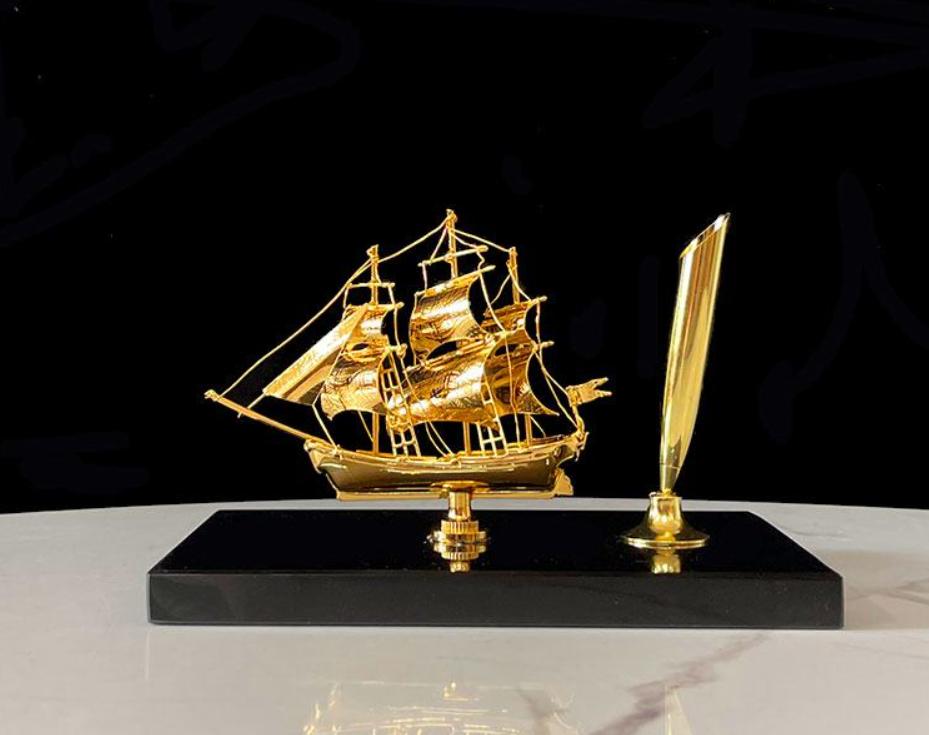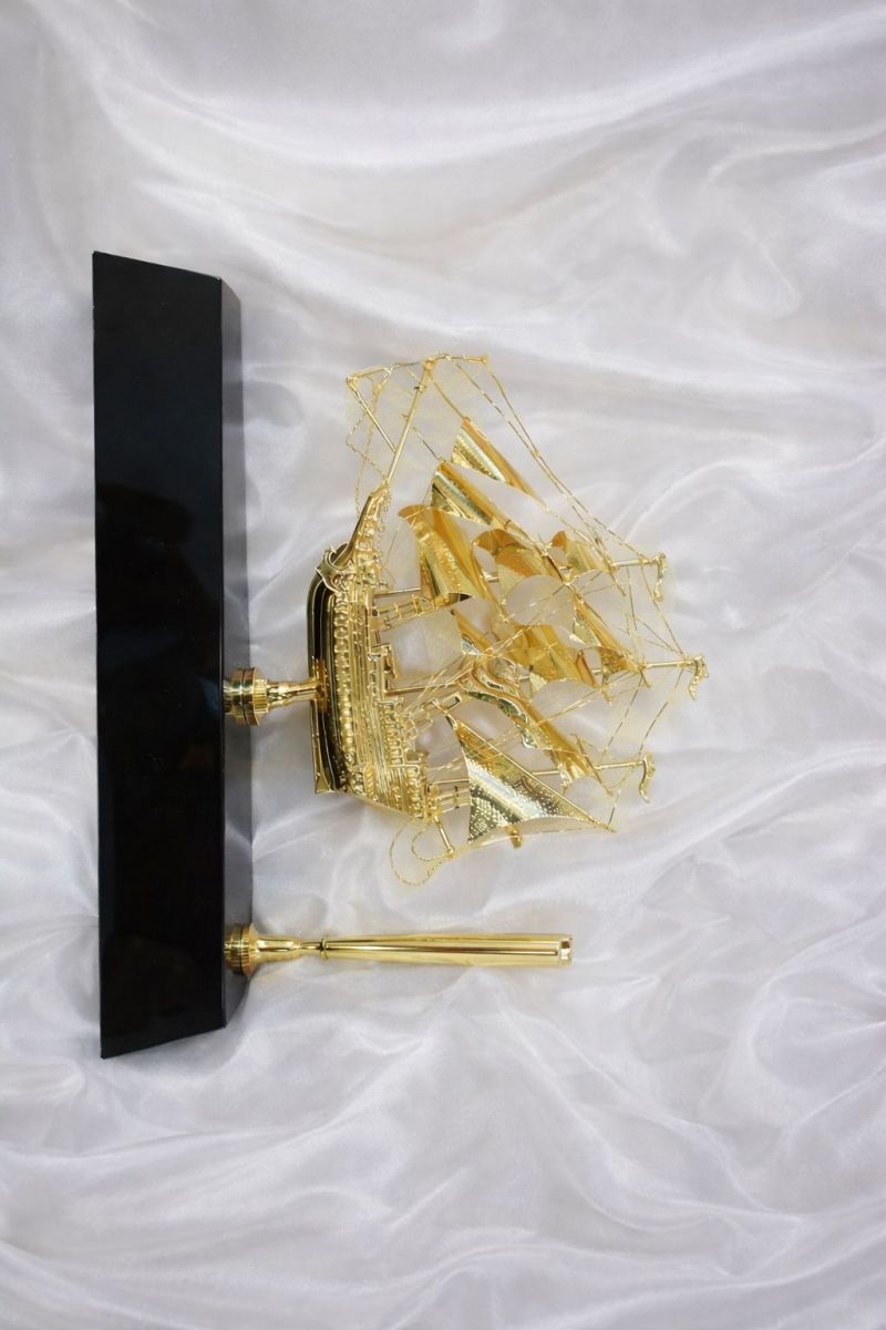 Lớp dát vàng 24k phủ lên toàn bộ mô hình tạo hiệu ứng ánh kim nổi bật, giúp thuyền bắt sáng đẹp mắt và trở thành điểm nhấn sang trọng trong mọi không gian trưng bày. Những đường vân trên cánh buồm và thân thuyền được khắc họa tinh tế, giúp mô hình trông sống động và có chiều sâu, gợi lên hình ảnh con thuyền mạnh mẽ vươn mình ra biển lớn.