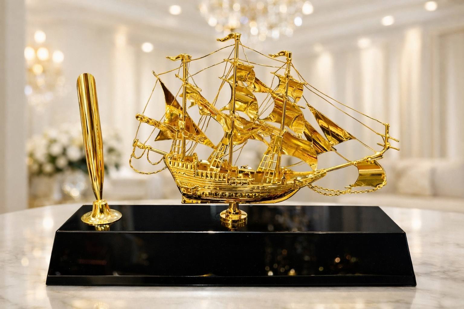 Lớp dát vàng 24k bao phủ toàn bộ mô hình càng làm tăng giá trị phong thuỷ, bởi vàng tượng trưng cho phú quý, tài lộc và sự hưng vượng. Khi trưng bày thuyền buồm dát vàng, gia chủ như đang thu hút thêm năng lượng dương, kích hoạt vận may tài chính và sự thăng tiến.