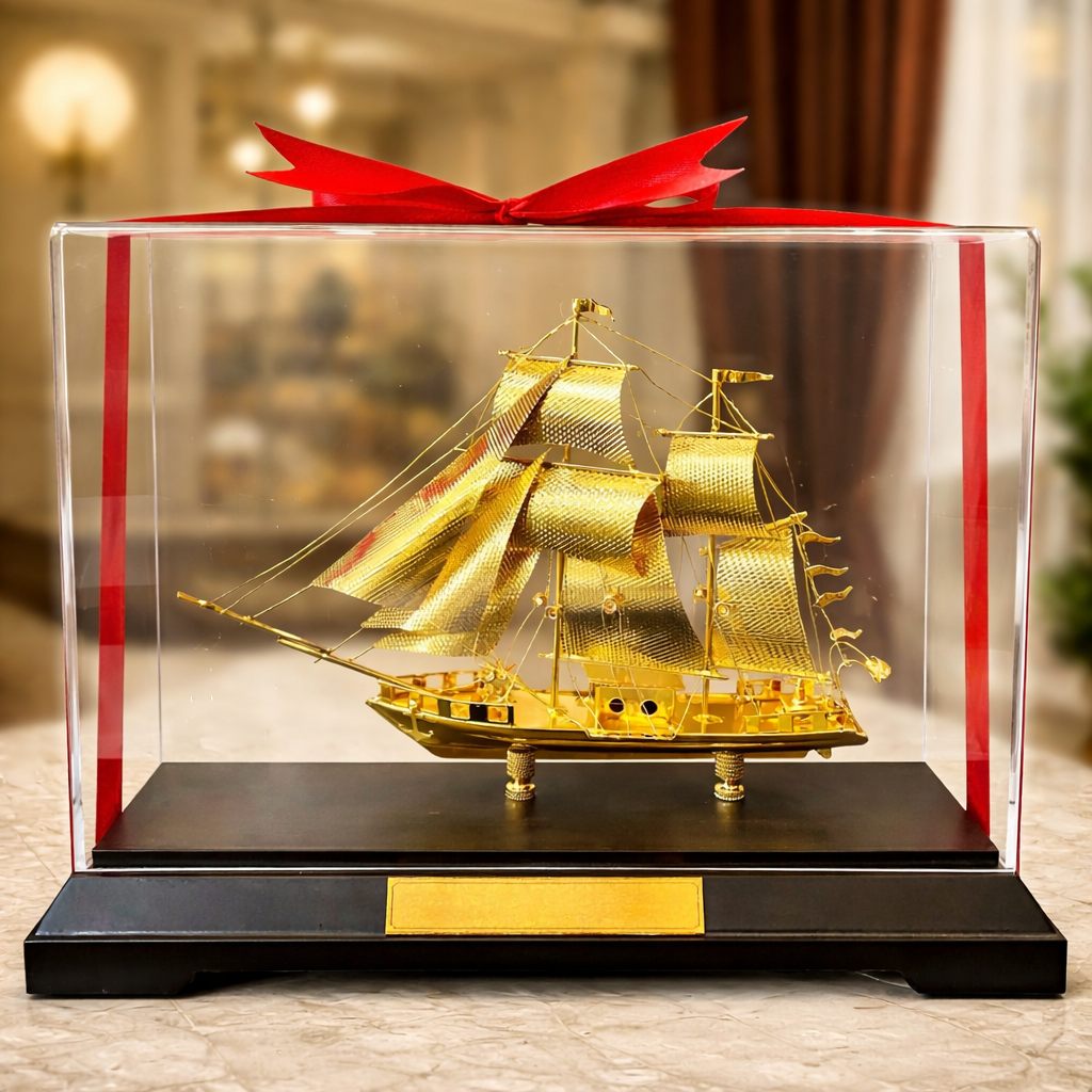 Ngay từ cái nhìn đầu tiên, mẫu thuyền buồm mạ vàng MS 2 gây ấn tượng với vẻ đẹp nổi bật của gam màu vàng sang trọng kết hợp cùng phần đế trưng bày chắc chắn. Từng cánh buồm, thân thuyền và các chi tiết nhỏ đều được chế tác tỉ mỉ, mang đến tổng thể hài hòa, đẳng cấp và giàu giá trị thẩm mỹ. Đây không chỉ là vật phẩm trang trí đẹp mắt mà còn là món quà thể hiện sự trân trọng và lời chúc tốt lành dành cho người nhận.