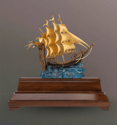 Quatangonet.com hân hạnh giới thiệu mẫu mô hình thuyền buồm phong thuỷ mạ vàng 24K - 11, một tuyệt tác kết hợp hoàn hảo giữa nghệ thuật chế tác tinh xảo và giá trị phong thuỷ sâu sắc.
