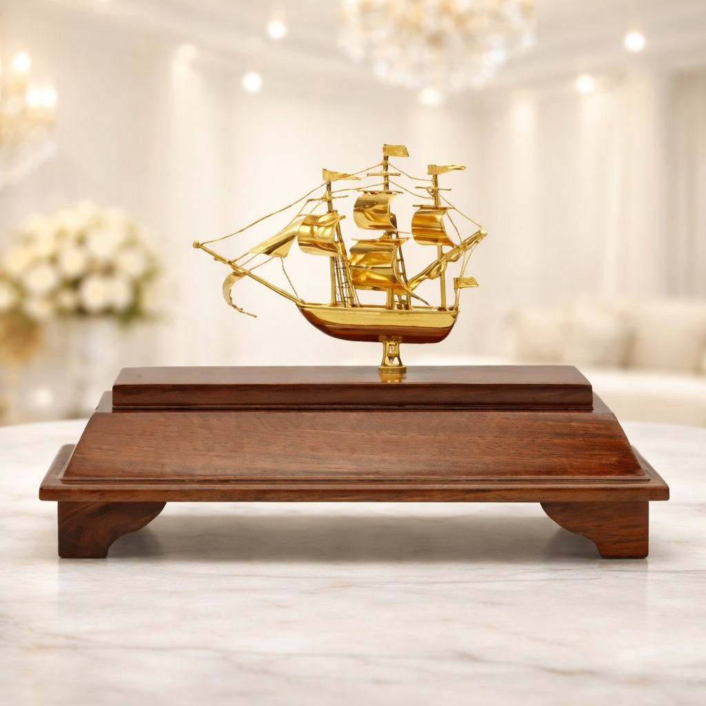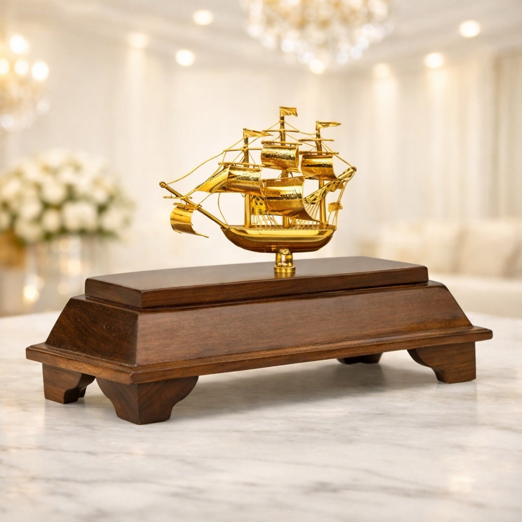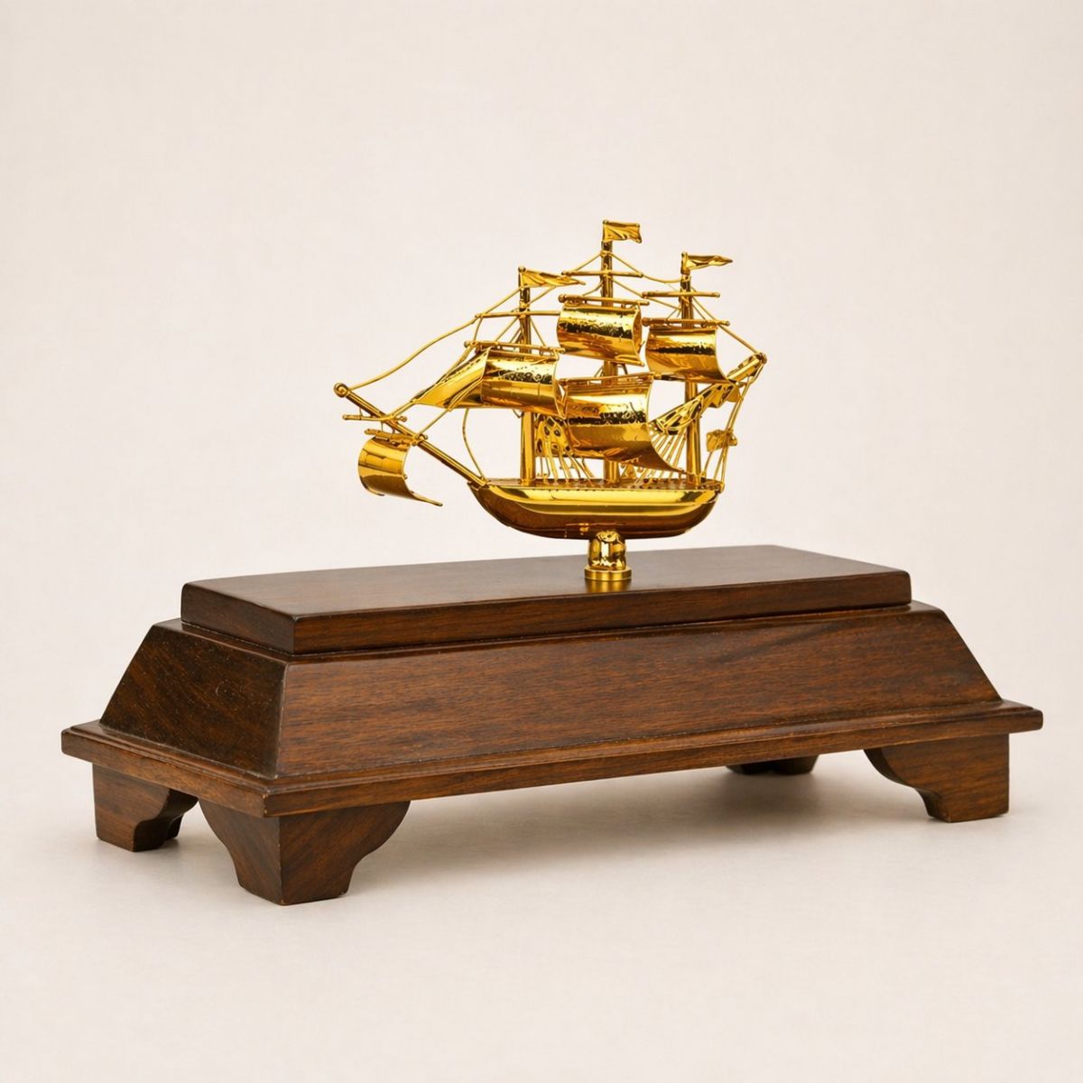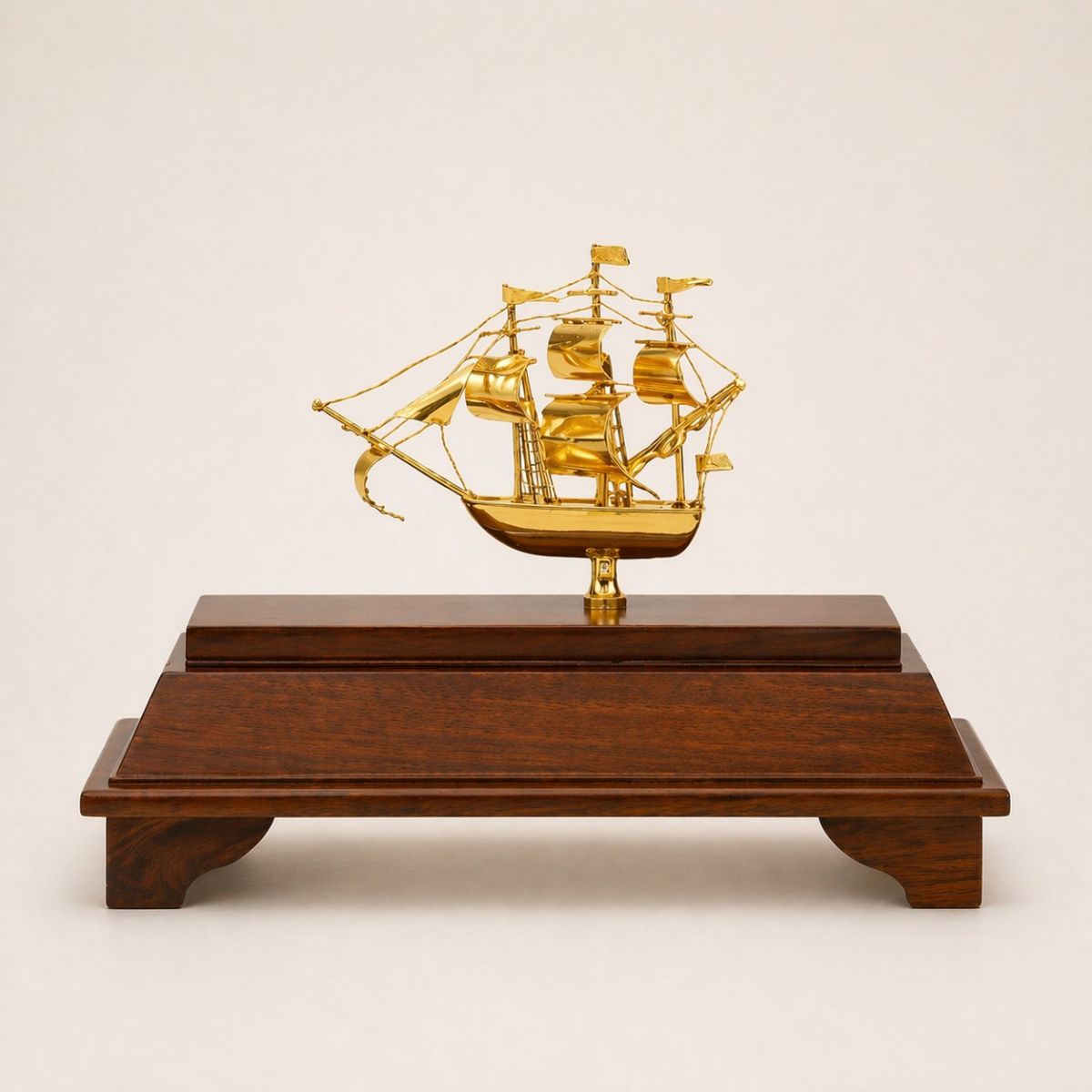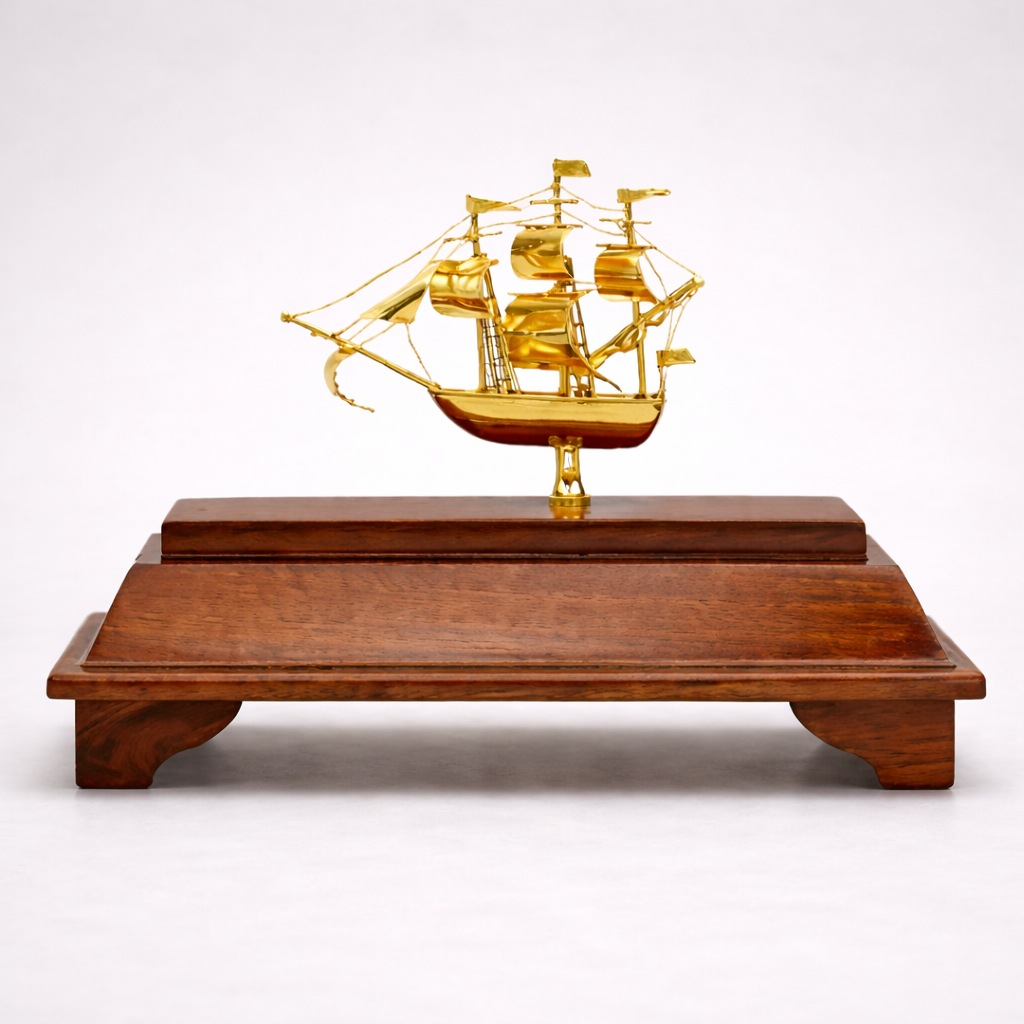 Phần thân và cánh buồm được chế tác hoàn toàn từ kim loại mạ vàng 24k, tạo nên bề mặt sáng bóng, sắc nét và vô cùng bắt mắt. Từng đường cong của thân thuyền, dây buồm, mỏ neo cho đến các chi tiết trang trí đều được gia công tỉ mỉ, mang lại cảm giác mềm mại nhưng dứt khoát – thể hiện tinh thần vươn khơi mạnh mẽ của biểu tượng “thuận buồm xuôi gió”.