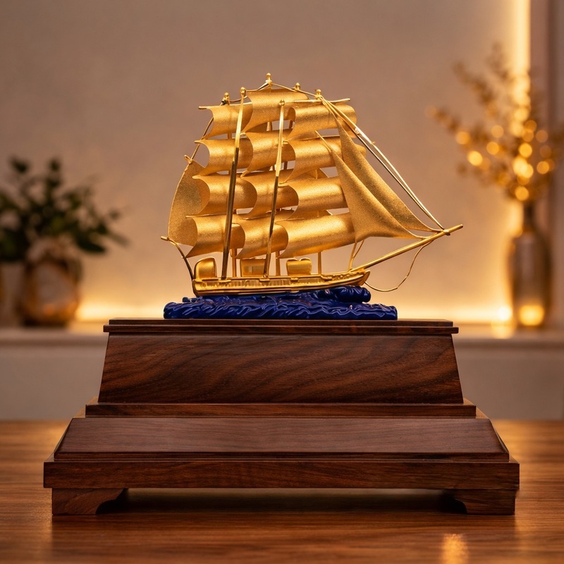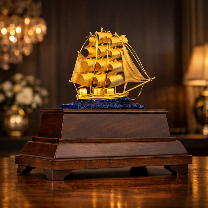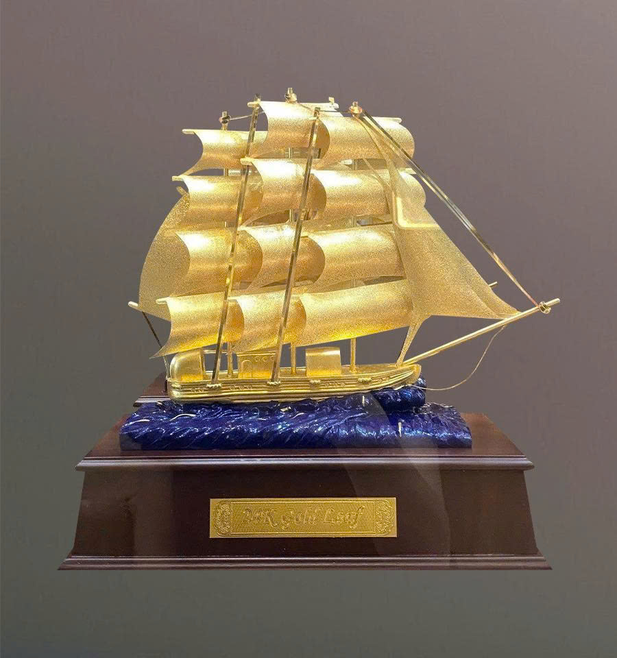 Mô hình được chế tác thủ công tinh tế từ kim loại mạ vàng 24K cao cấp, thể hiện đường nét mềm mại của những cánh buồm căng tràn sức gió, vươn mình ra khơi giữa sóng nước xanh biếc. Phần thân thuyền, cột buồm và dây neo đều được gia công tỉ mỉ, tạo cảm giác chân thực và đầy sinh động.