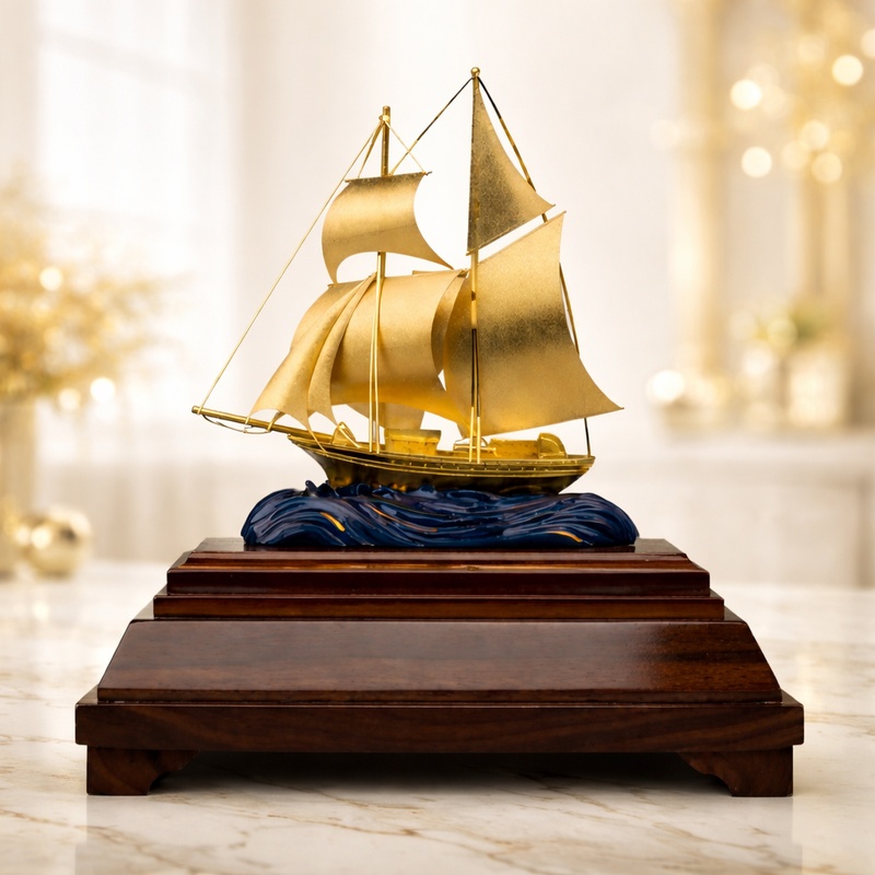 Mô hình thuyền buồm phong thủy mạ vàng 24K – 06 là lựa chọn quà tặng đẳng cấp dành cho doanh nhân, sếp, đối tác và khách hàng VIP. Với thiết kế tinh xảo, từng chi tiết được phủ vàng 24K sang trọng, sản phẩm không chỉ tôn vinh giá trị thẩm mỹ mà còn mang ý nghĩa phong thủy sâu sắc về sự hanh thông, may mắn và “thuận buồm xuôi gió” trong sự nghiệp. Tại Quatangonet.com, mẫu thuyền buồm mạ vàng – 06 luôn được yêu thích bởi sự nổi bật, chất lượng vượt trội và tính biểu trưng mạnh mẽ, phù hợp trưng bày phòng làm việc, phòng khách hay làm quà biếu cao cấp.