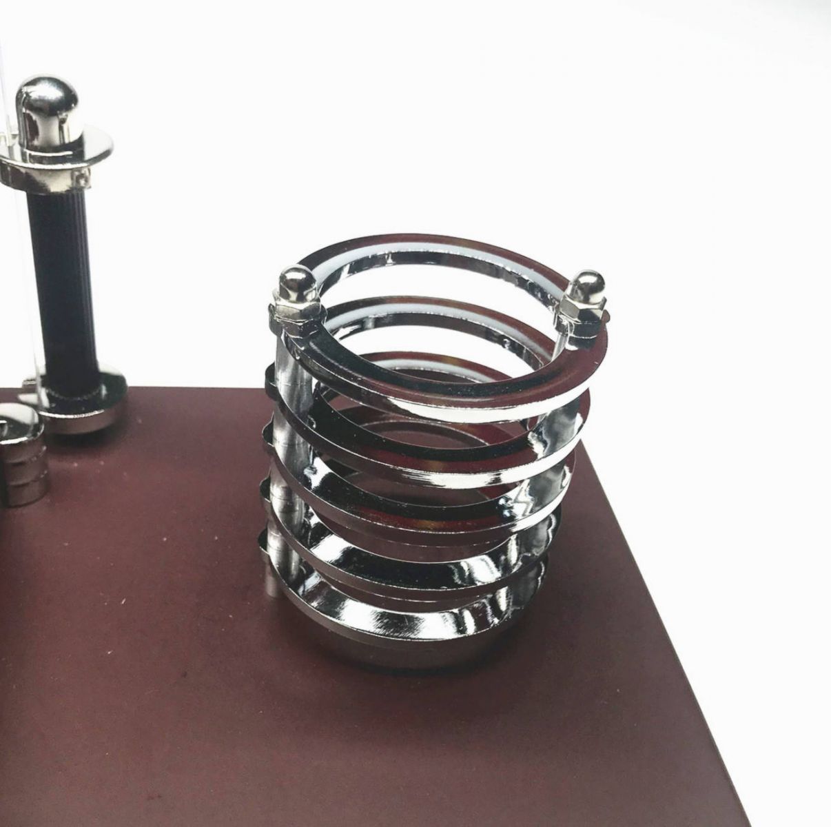 Sản phẩm được làm từ chất liệu hợp kim cao cấp kết hợp cùng đế gỗ tự nhiên sơn nâu bóng, mang lại vẻ đẹp vừa cổ điển vừa hiện đại. Trên đế bố trí đầy đủ các tiện ích: đồng hồ điện tử hiển thị giờ, ngày, tháng; hộp đựng bút kim loại sáng bóng và khay giấy ghi chú tinh gọn. Tất cả tạo nên một bố cục hài hòa, vừa thẩm mỹ vừa hữu dụng.