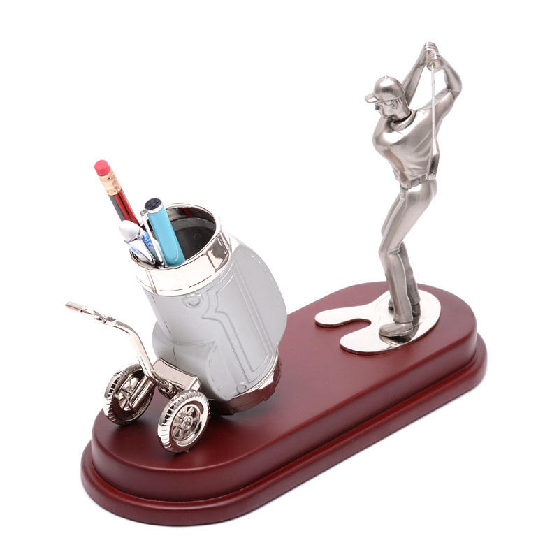 - Bên cạnh tượng golfer là mô hình túi gậy golf mini, được mô phỏng chi tiết với thân túi bo tròn, các đường chỉ và bề mặt được làm mịn đẹp mắt. Điểm nhấn là phần chân đế dạng xe kéo với bánh xe trang trí tỉ mỉ, mang lại cảm giác chuyên nghiệp và đúng tinh thần golf. Phần miệng túi được thiết kế như một hộc đựng bút, giúp sản phẩm không chỉ đẹp mà còn hữu dụng trên bàn làm việc.